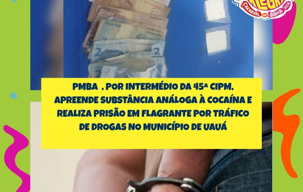 A Polícia Militar da Bahia (PMBA), por intermédio da 45ª Companhia Independente de Polícia Militar (CIPM/Curaçá), realizou, nesta segunda-feira (16), a apreensão de substância análoga à cocaína e a prisão em flagrante por tráfico de drogas no município de Uauá.Durante a intensificação do policiamento no Carnaval Paralelo de Uauá, os policiais avistaram um indivíduo fazendo uso de drogas (substância análoga à cocaína) no banheiro de um quiosque. Foi realizada a abordagem, sendo encontrados mais três papelotes da mesma substância e R$ 280,00 em espécie.Diante dos fatos, foi dada voz de prisão em flagrante. Todo o material apreendido, juntamente com o suspeito, foi conduzido à Delegacia de Polícia Civil para registro da ocorrência e adoção das medidas legais cabíveis.
