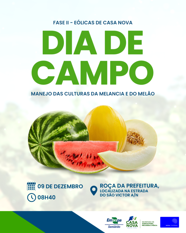 A Prefeitura de Casa Nova, por meio da Secretaria de Agricultura, Pecuária e Pesca, realiza mais uma importante ação voltada ao fortalecimento do campo e ao avanço da produção local. Em parceria com a Embrapa Semiárido e a Axia Energia, será promovido nesta terça-feira (9), um Dia de Campo especialmente dedicado ao manejo do melão e da melancia. O encontro acontecerá, a partir das 8h40, na Roça da Prefeitura e