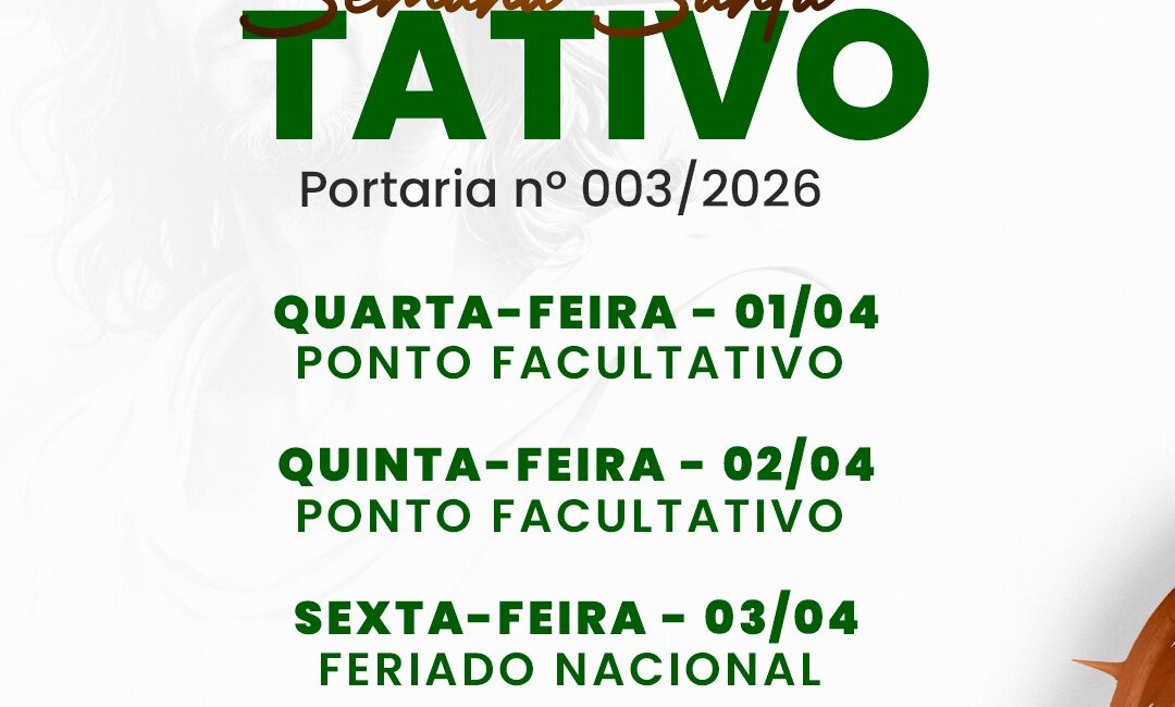 A Prefeitura de Casa Nova publicou a Portaria nº 003/2026, que estabelece ponto facultativo nos dias 1º e 2 de abril nos órgãos e entidades da Administração Pública Municipal direta, autárquica e fundacional, em razão das celebrações da Semana Santa.